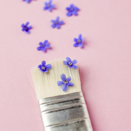 Brush repainting by flowers pink background. Minimal spring, summer romantic concept, flat lay, punchy pastel