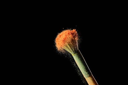 cosmetic brush with colorful orange powder cloud on black background