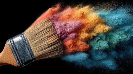 A paintbrush releases a spectrum of vibrant powdered pigments against a dark background, showing a beautiful explosion of colors that captivates the eye and sparks imagination.