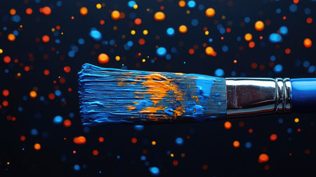 A paintbrush with blue bristles, holding yellow and orange paint, creating vibrant color splashes on a dark navy background. High-quality photograph. Studio lighting. Minimalist stock photography style. The brush is placed at the bottom right of an isolated canvas, with scattered colorful dots representing different colors being applied --chaos 30 --ar 16:9 --stylize 500 --v 6.1 Job ID: 59606c15-0c32-40f8-ade1-3fab8adca5b7