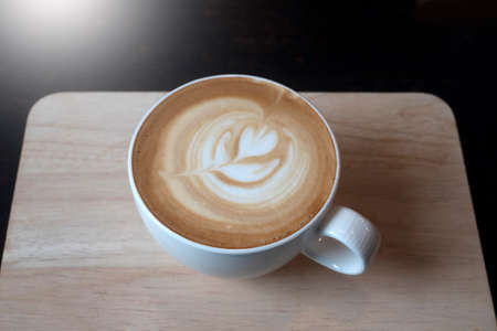 Hot art Latte Coffee in a cup on wooden table and Coffee shop blur background with bokeh image.