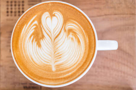 Beautiful hot coffee latte art design foam inside black cup with wooden background. Top view