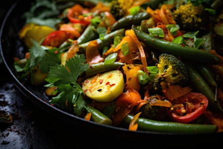 A vivid scene of fresh vegetables being stir-fried in a black pan on a stove. The array of colors creates an appealing and inviting atmosphere in the kitchen.