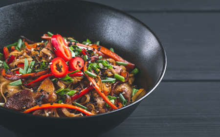 Fresh asian vegetables mix, Thai wok in a black pan on the black background with copy space. Healthy food