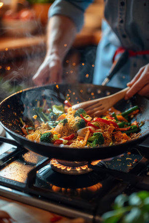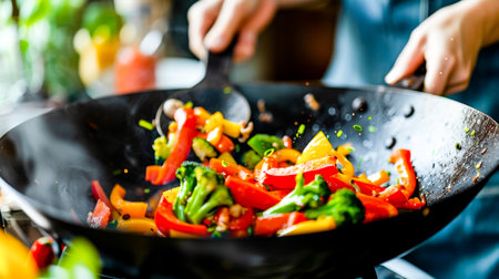 Close-up of female hands tossing colorful chopped vegetables in a wok, the essence of vegetarian stir fry coming to life.