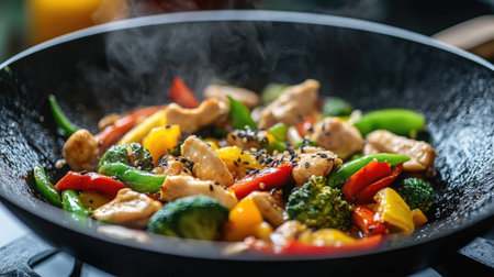 A vibrant stir-fry of colorful vegetables and chicken in a wok, sizzling hot.