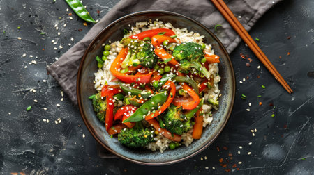 Stir-fry with mushrooms, vegetables and rice on dark background. Asian style food