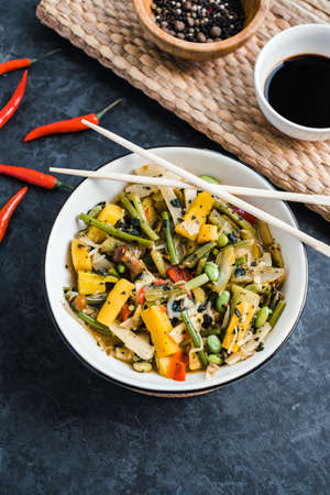 healthy plant-based food recipes concept, vegan asian inspired stir fry with plant-based protein