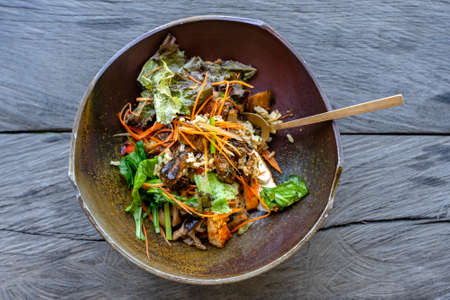 Organic salad from green curry rice, eggplant, kimchi, braised greens, mushroom, tempeh bacon, tofu is served in a clay bowl. Close up. The concept of healthy eating.