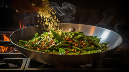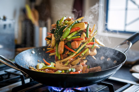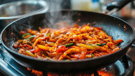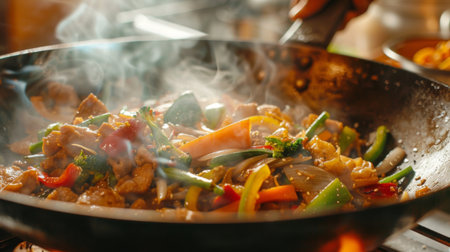 A vibrant stir-fry cooking in a pan, featuring fresh vegetables and spices, with steam rising and a savory aroma filling the kitchen. Perfect for inspiring culinary creativity.