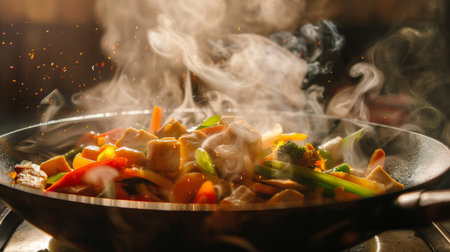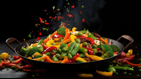 A colorful assortment of vegetables sizzling in a wok, surrounded by steam. Perfect for showcasing vibrant cooking techniques and healthy meals.