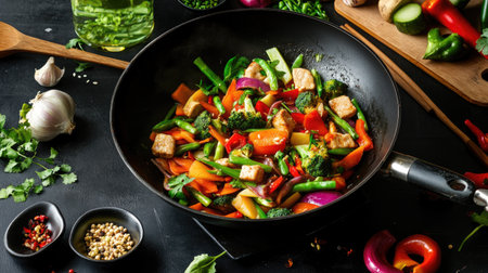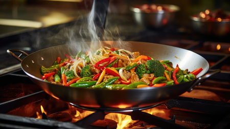 A colorful stir-fry sizzling in a hot wok, with vibrant vegetables and meat