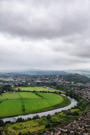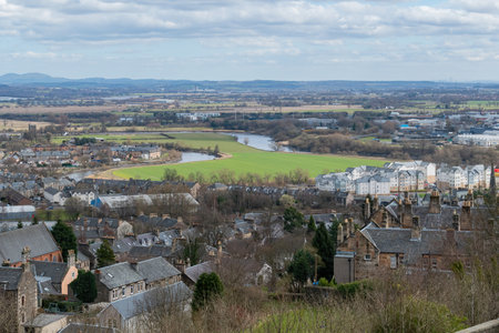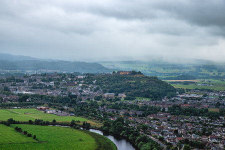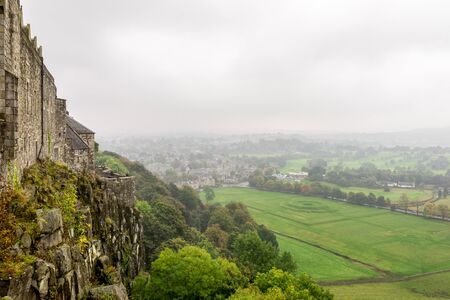 A spectacular view to countryside and suburbs from Stirling Castle walls in cloudy weather with fog and haze, Scotland