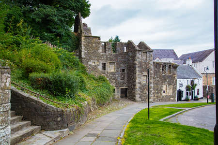 Stirling Castle yard with a green lawn, exhibition halls and stone walls to walk around in autumn rainy day, Scotland, Great Britain