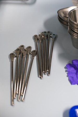 Set of logopedic probes for speech therapy on light blue background, flat lay