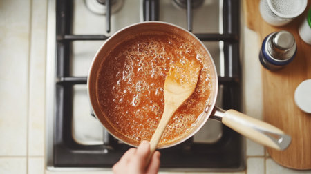 A close-up view of a bubbling sauce in a saucepan on the stovetop, showcasing a wooden spoon stirring the flavorful mixture during the cooking process.