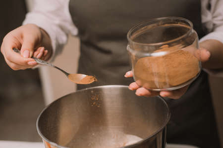 The cook girl pours brown cane sugar into a metal bowl. Cooking sweets in the kitchen