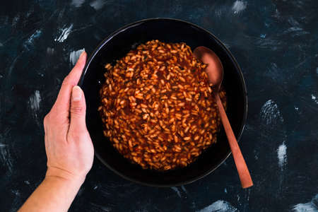 vegan risotto with red pesto tomato sauce, healthy plant-based food recipes