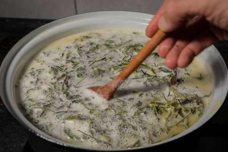 Chef stirring sauce in stainless steel pot, close-up. Professional kitchen, restaurant.