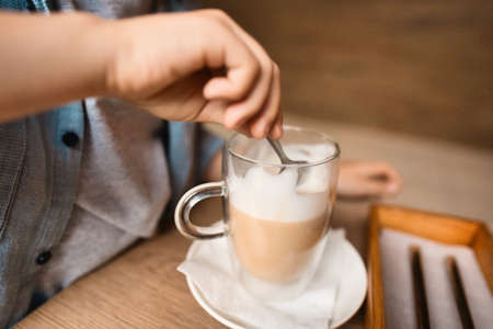 The girl stirs sugar in a cup of coffee. Close-up, lifestyle.