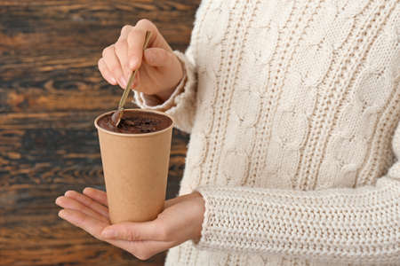 A woman holds in her hands a jar filled with fragrant natural cocoa powder, which she takes out with a teaspoon. The process of making a delicious invigorating pleasant drink for breakfast.