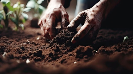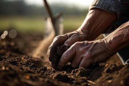 close-up of farmers hands, tilling the soil and preparing for a new season, created with generative ai
