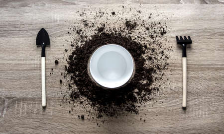 wooden background concept earth piled circle disc rake fork spade white pot knife spoon texture planting center spring