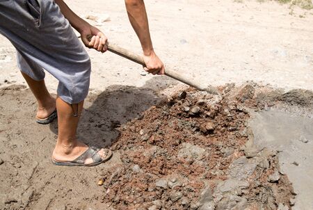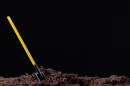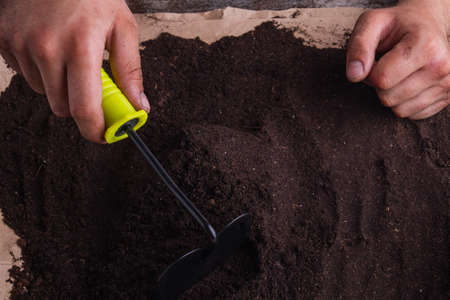 Man's using garden trowel shovel hoe tool. Close-up. Pile of soil.