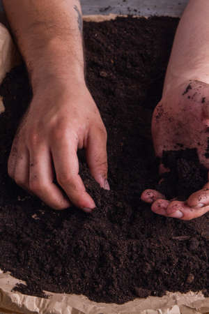 Farmer working with the ground with naked hands. Grabbing and parsing soil, close-up.