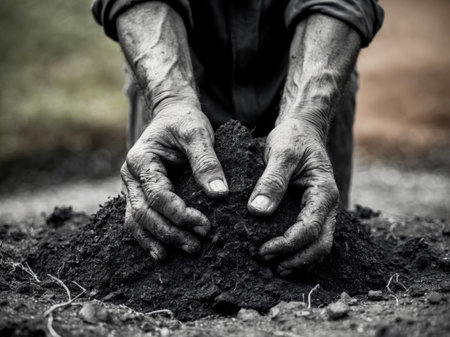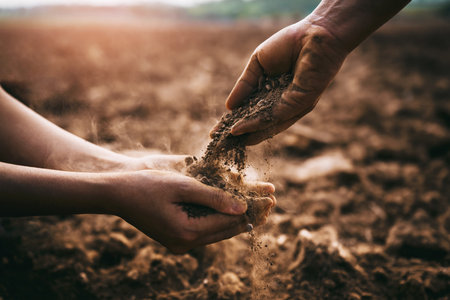 Hands hard at work in the soil, Close-up of farmer hands holding a handful of earth, symbolizing the connection between humans and nature.