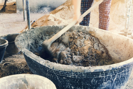 Close-up of dry cement powder clumping as water is poured in, with a wooden stick ready for mixing