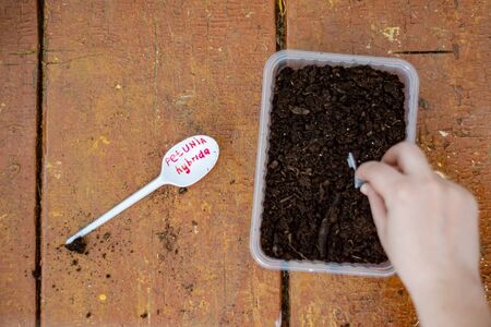 Gardening concept two hand of a gardener inserting rich black soil to nursery trays preparing for growing seedlings.