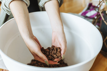 Mans hands filling a crystal vase pot with soil. Home gardening.