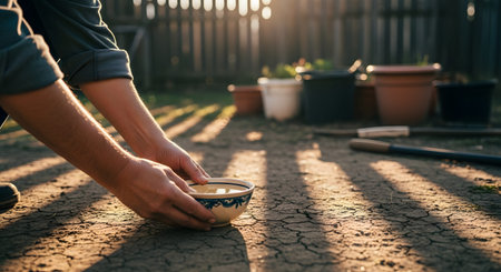 A person's hands place a small bowl of water onto cracked, dry earth in a garden setting during sunset. The image evokes themes of drought, water scarcity, hope, and caring for nature or thirsty animals.