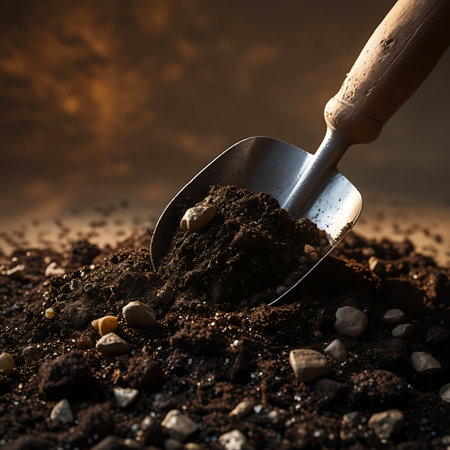 A garden trowel, filled with dark, rich soil and small stones, is angled against a warm, softly blurred brown background. The metallic sheen of the trowel contrasts with the earthy texture of the soil and the wooden handle. The image emphasizes the details of the gardening tool and the soil's composition.