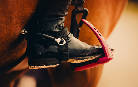 Leather elegant boot riding rider rests on a metal stirrup, which is one of the components of equestrian equipment.