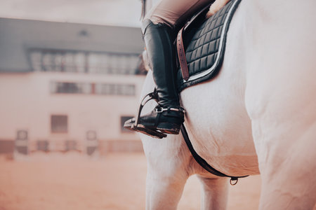 A rider in leather boots sits on a white horse in the saddle. Sports equipment and stirrups. Equestrian sports and horse riding.