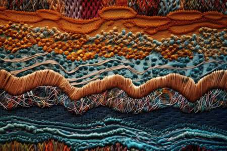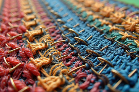 Intricate stitches in fabric from colored threads. AI generated illustration