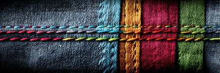 Textured surface of denim fabric reveals vibrant stitching in various colors, highlighting craftsmanship and design elements typical in modern textile work.