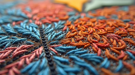 Vibrant close-up of intricate embroidery with blue and orange threads. That the image is generated using AI.