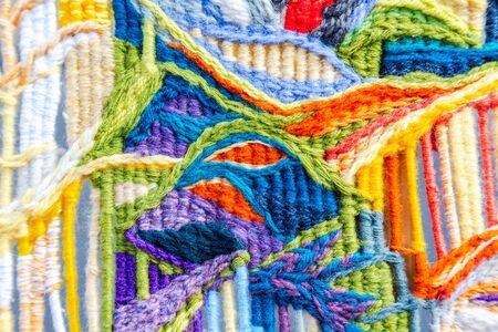 Embroidery fabric with hand embroidered colorful elements. Kids learning to do creative crafts at school. Beautiful pattern and texture background