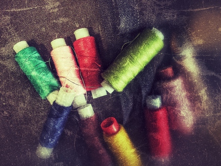 Sewing threads as a multicolored background. High angle view of colored threads for tailor job.