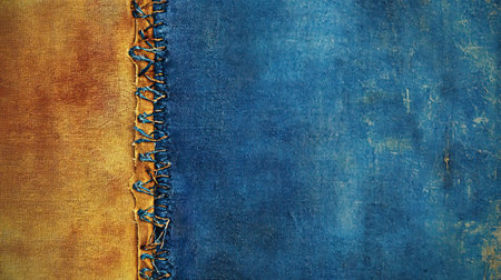 Denim fabric with frayed edges and contrasting threads showcases blend of textures and colors, highlighting craftsmanship and wear of material. intricate details evoke sense of durability