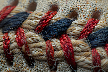 Detailed close-up of a nautical-themed braided rope showcasing intricate interweaving of red, blue, and beige fibers. perfect for decorative uses or crafting projects, enhancing the maritime or coastal aesthetic in various designs. Generative AI