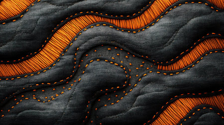 Black fabric background with stitched orange thread stripes in irregular organic patterns, textile-inspired design