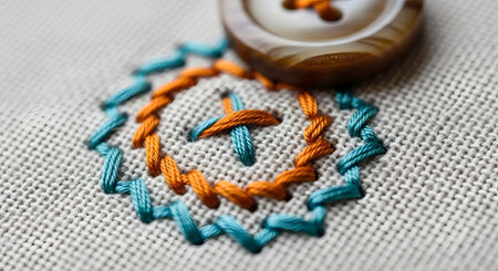 A macro shot of intricate hand embroidery surrounding a brown button on light fabric. The design features orange and teal threads stitched in a decorative circular pattern, highlighting craftsmanship and sewing skills.