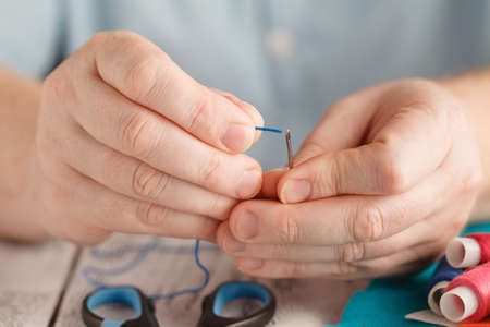 The workplace of a seamstress. The dressmaker works on a sewing machine. A tailor threads a thread into a sewing machine at his workplace. Hobby-sewing as a small business concept. High quality photo