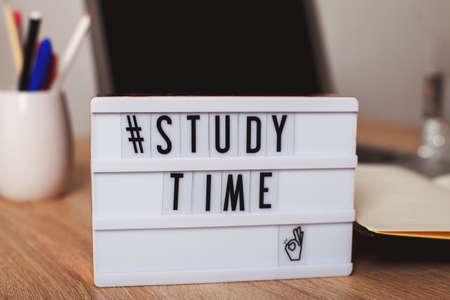 lightbox with the inscription time to study. In the background is a laptop, a notebook and a notebook with writing supplies - pens and pencils. a message for students.
