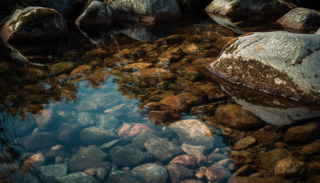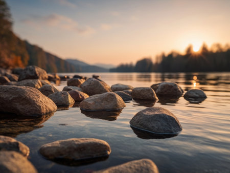 Close-up of rounded stones partially submerged in calm water, reflecting a soft, warm light. The image displays a natural, serene environment with blurred reflections. It presents a tranquil setting likely outdoors during daylight, suitable for various editorial and commercial applications. The composition emphasizes texture and natural beauty.