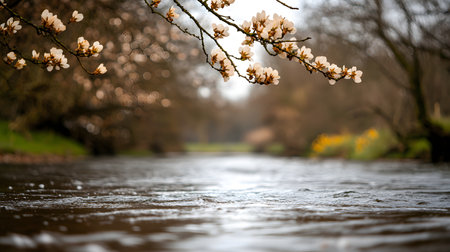 Cherry blossoms gently sway above a calm stream, with soft light reflecting off the water’s surface. The blurred background suggests a peaceful, natural setting filled with greenery.